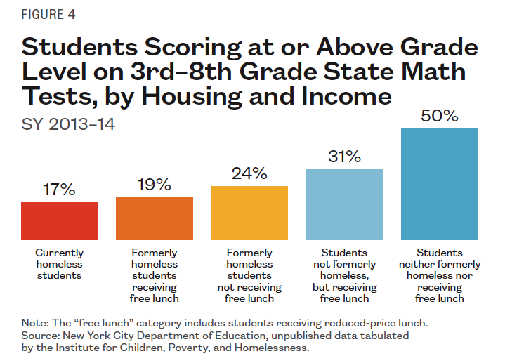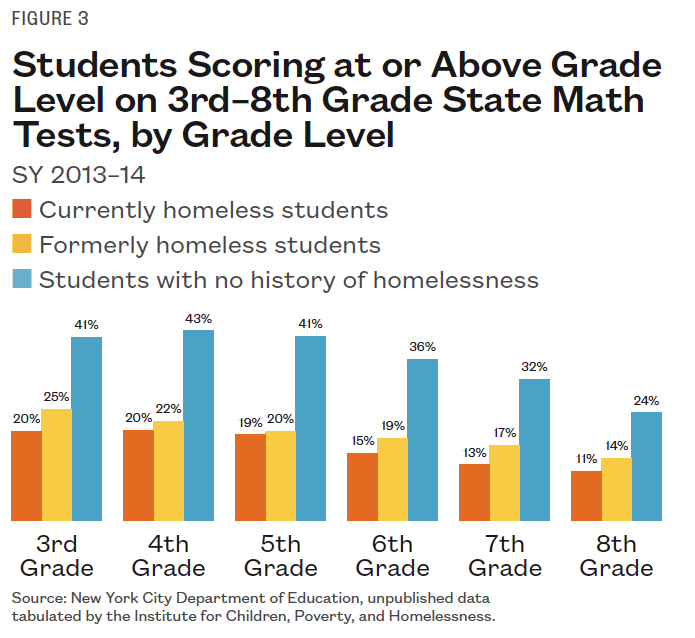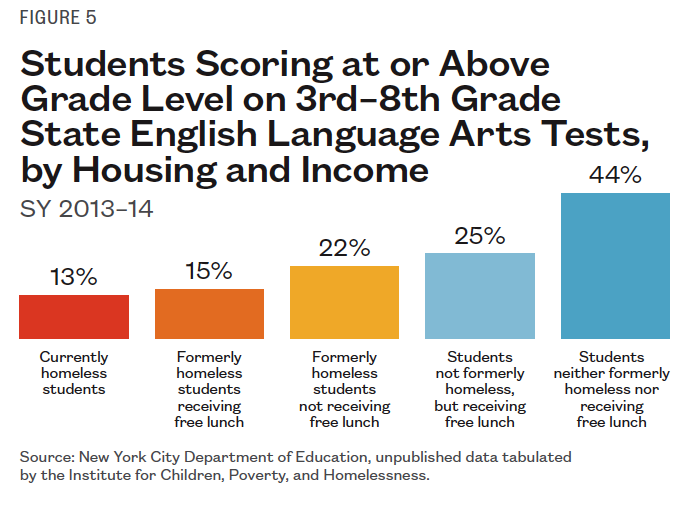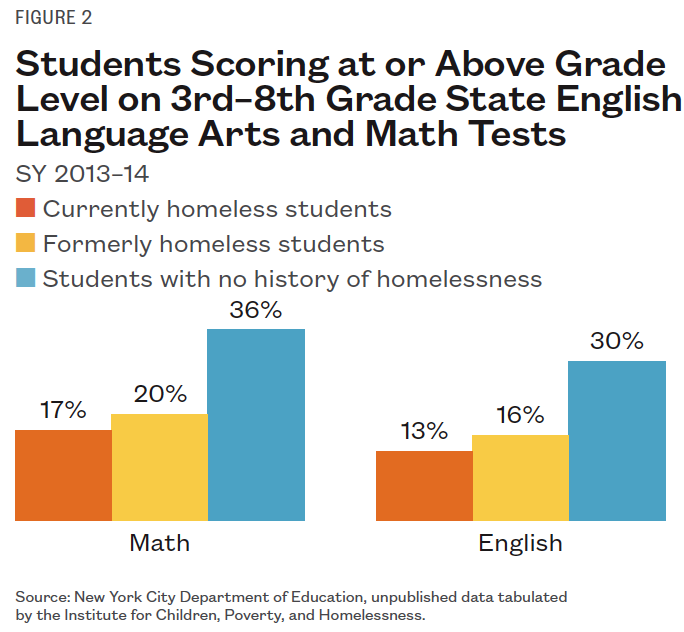 Homeless students achieve proficiency on New York State standardized English and math tests at roughly half the rate of housed students. In SY 2013–14 only 1 in 8 (13%) homeless students met grade standards in English and less than 1 in 5 (17%) did so in math.