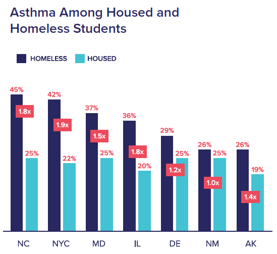 - Reported asthma rates for homeless students ranged from a high of 45% in North Carolina to a low of 26% in New Mexico and Alaska. Meanwhile, rates for housed students were relatively consistent, ranging between 19% and 25%. This suggests that poor housing and environmental factors, coupled with irregular healthcare access, are disproportionately affecting homeless students.