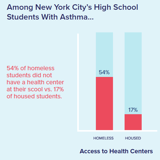 - Homeless students with asthma in New York City were over three times less likely to attend a high school with a health center. More than half (54%) did not have a health center, compared to only 17% of housed students with asthma.