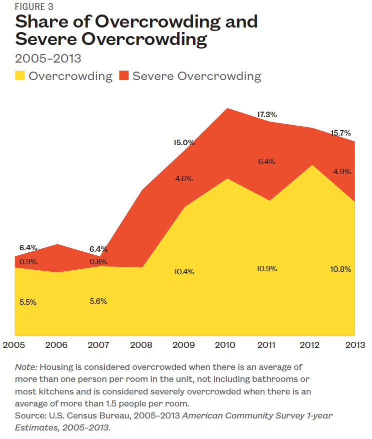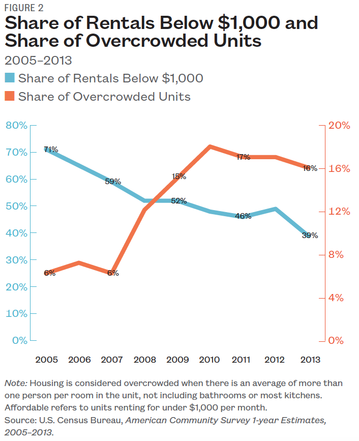 At the same time as affordable housing declined, rental unit overcrowding—often a proxy for homeless families doubled up with friends or family, and the most frequent living situation of families prior to entering shelter—almost tripled, rising from 6% in 2005 to 16% in 2013.