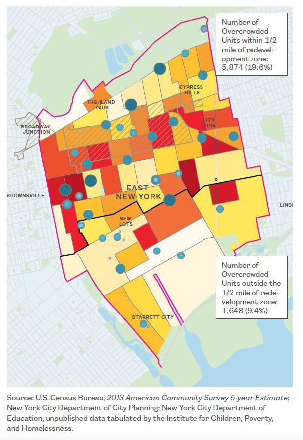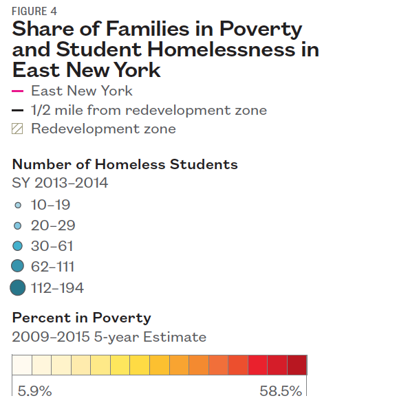 Crucially, not all of East New York faces the same level of economic instability; poverty is distributed unevenly block by block throughout the neighborhood. It remains to be seen whether the City’s proposed redevelopment will prevent more families from becoming homeless or how it will address this uneven experience of poverty. In fact, data suggest that affordable housing redevelopment plans that fail to address the neighborhood’s poorest residents will likely contribute to increasing family homelessness.