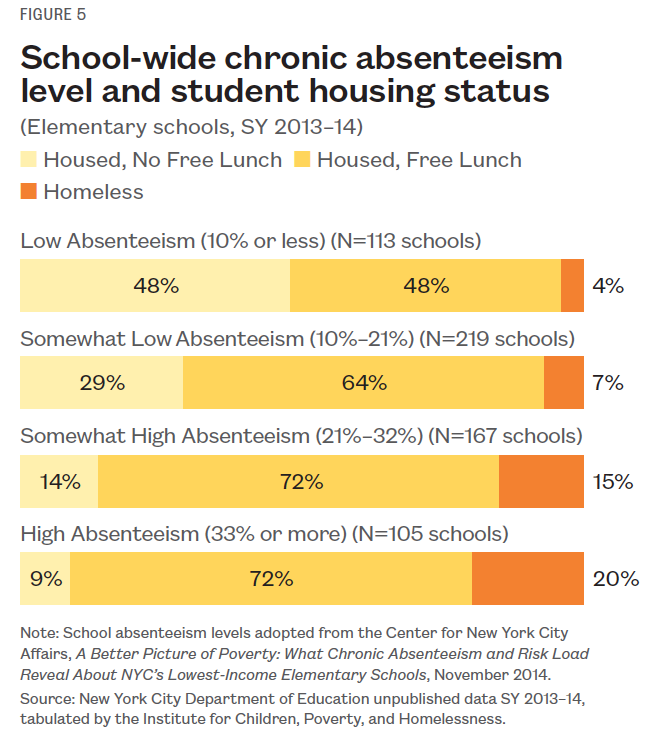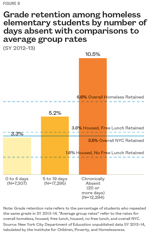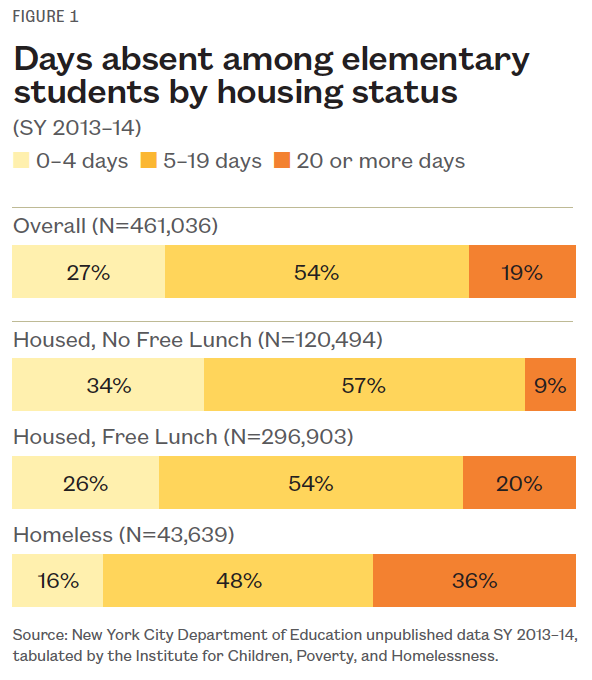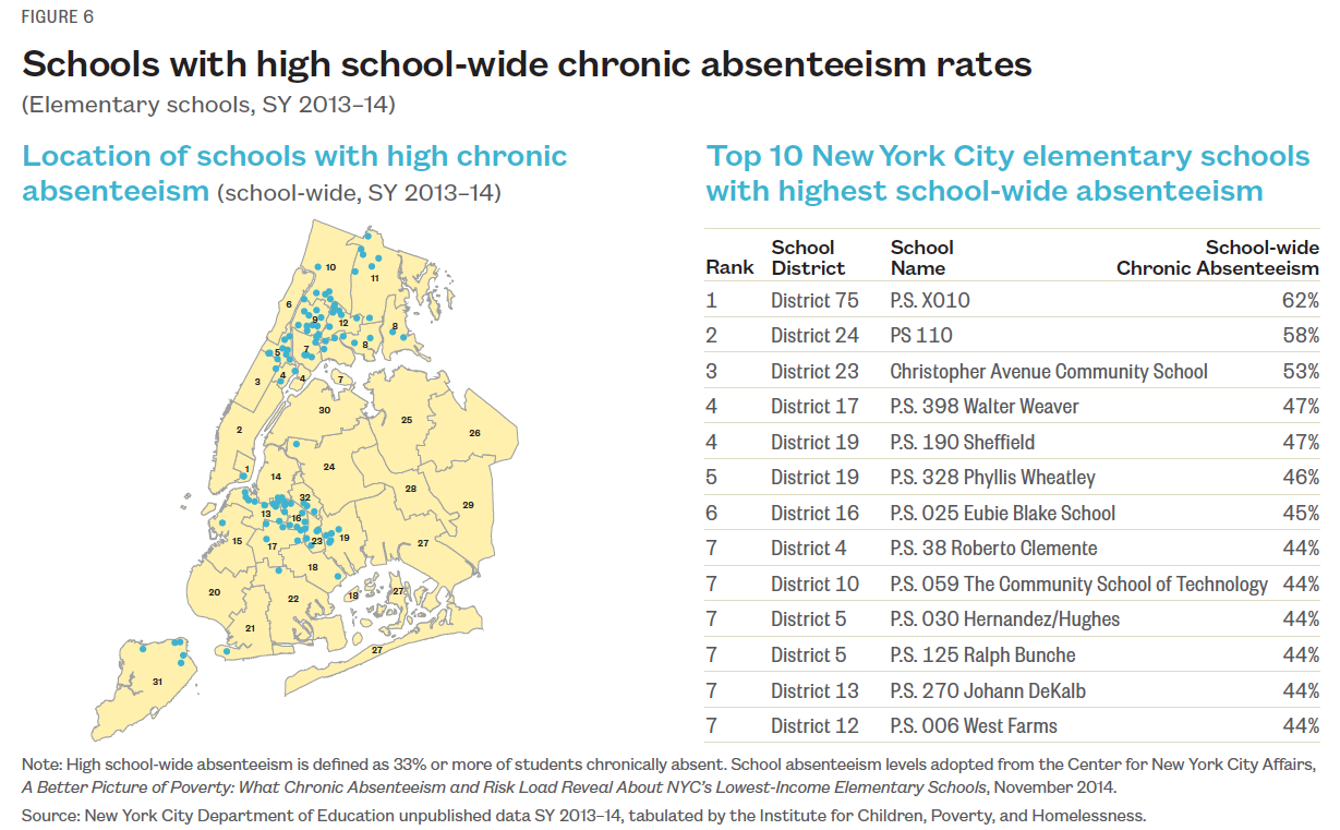 School absences are pervasive across New York City. Almost 1 in 5 New York City public school elementary students (19%) were chronically absent in SY 2013–14, missing 20 days or more of school. Worse, homeless elementary students were chronically absent at roughly twice the rate of elementary students overall. Chronic absenteeism is correlated with lower test scores, an increased risk of being held back, and higher dropout rates. Homeless students disproportionately face these challenges, and their greater likelihood of being chronically absent places them at even more risk. This report builds on the work of the 2015 Atlas of Student Homelessness in New York City by examining the disparities in absenteeism and its impact on educational achievement, comparing homeless students and their housed peers, regardless of family income level.