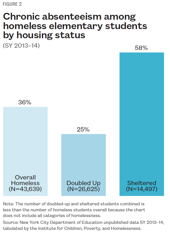 Homeless children were chronically absent at almost twice the overall citywide rate—36% compared to 19% in SY 2013–14.