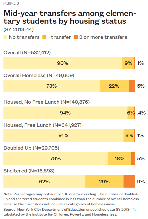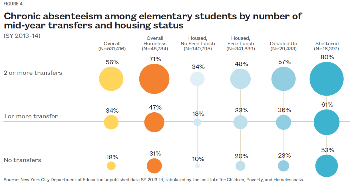 School transfers greatly increase rates of chronic absenteeism. Of the 1,600 homeless elementary students living in shelter who transferred twice or more in SY 2013–14, 80% were chronically absent.