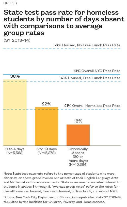 Homeless elementary students who missed fewer than five days of school passed State assessment tests at about the same rate as their low-income housed peers (38% compared to 37%). Just 12% of chronically absent homeless students achieved proficiency in either their English Language Arts or Math test.