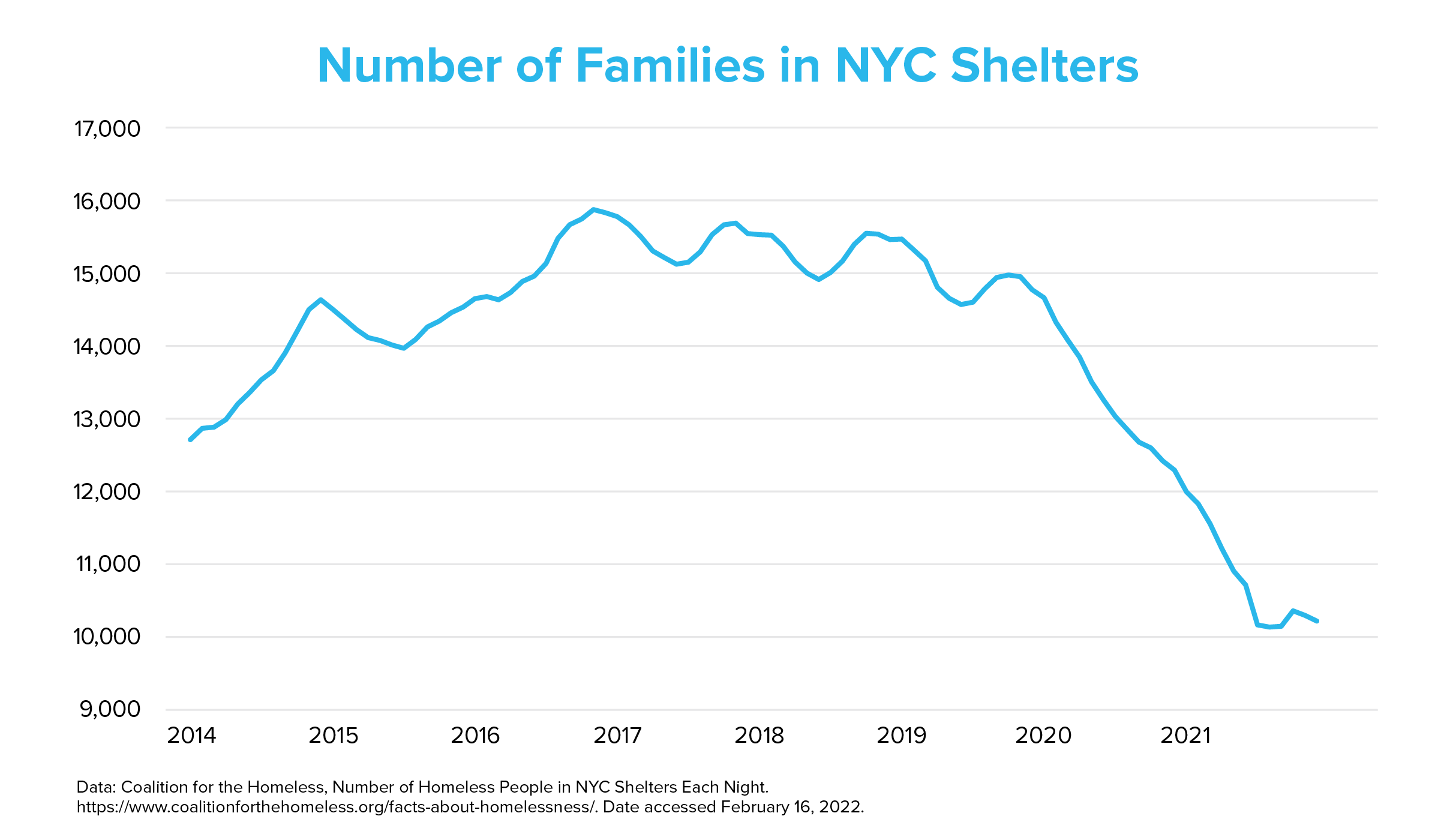 Confronting New York City’s family homelessness crisis was a challenge for Mayor Bill de Blasio. When his term ended in December 2021, the number of families experiencing homelessness was lower than it had been at the start of his tenure—though this is no doubt due, in part, to the eviction moratorium put in place as an emergency response to the COVID-19 pandemic. Finding a long-term solution to family homelessness has been impossible for all the City’s recent mayors: from reliance on temporary vouchers, to the expense of constructing affordable housing, to the myriad needs of families in shelter, mayors have faced roadblocks to reducing the family shelter census and addressing the root causes of homelessness.