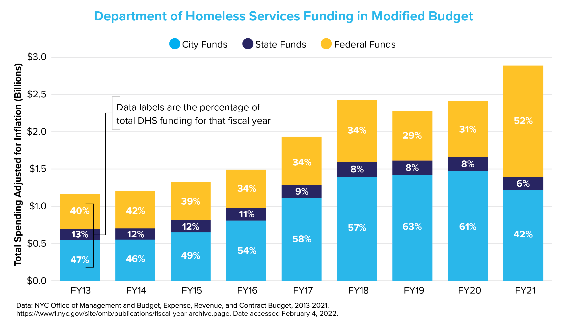 Despite this spotlight on family homelessness and the opportunity it presented for change, family homelessness remained a challenge throughout the de Blasio administration. While family homelessness decreased beginning in late 2019, there were still over 8,000 families in the system as of the time of publication, with the vast majority identifying as Black and Hispanic. Inequality and poverty have persisted, as well, compounded by the devastating impacts of COVID-19. De Blasio, like the four mayors before him, struggled to manage the dearth of affordable housing, voucher access and functionality, and economic stratification that drive the city’s inequities—and the family homelessness census. By the end of his tenure, the administration doubled the Department of Homeless Services’ budget, from what would have been $1.1 billion in 2021 dollars in FY 2015,30 to $2.2 billion in FY 2022.31 In the following sections, we will examine these policy and funding decisions and the environment in which the decisions were made, in order to assess the de Blasio administration’s ability to contend with these challenges.