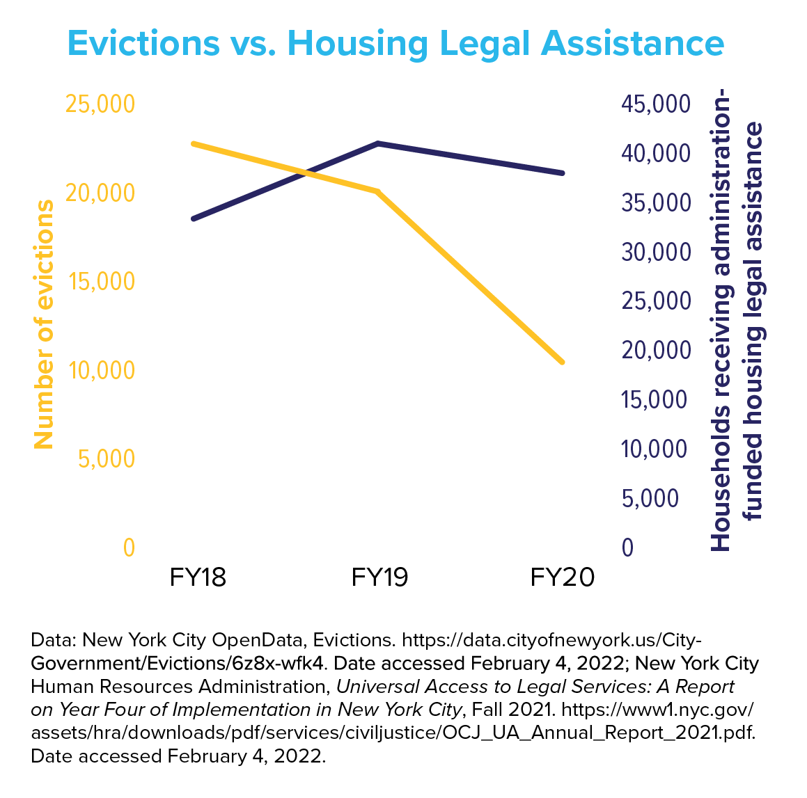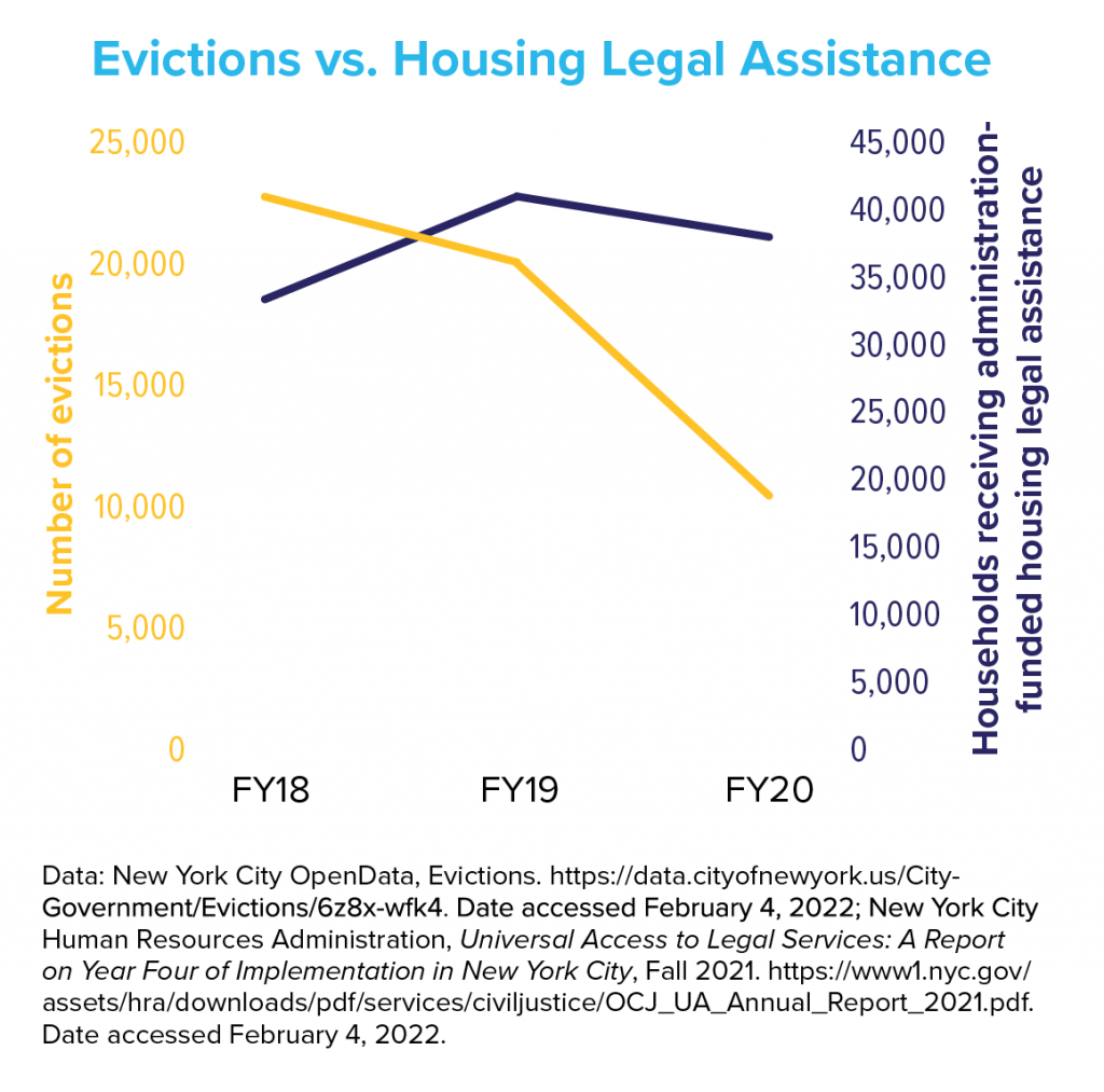 Eviction is the second-leading cause of family homelessness in New York City, behind domestic violence. In FY 2019, 21 percent of families in DHS shelter entered due to an eviction.60 In August 2017, New York City became the first municipality in the country to implement a legal “Right to Counsel” for residents facing eviction in housing court. Tenants with incomes below 200 percent of the federal poverty level have access to the program, which was initially phased in by zip code. The zip codes with the highest numbers of evictions and shelter entries were first to receive the program. In 2021, the program’s extension to all zip codes was fast-tracked in light of the COVID-19 pandemic, and as of June 1, 2021, all tenants in the five boroughs have access to an attorney in housing court.61 Data indicate that the Right to Counsel is reducing the number of New York City tenants facing eviction. The number of residential evictions in the city declined by 19 percent from 2017 to 2019. From July 2020 to July 2021, 84 percent of tenants represented by attorneys were able to remain in their homes, though there were many fewer eviction filings due to the COVID-19 eviction moratorium in effect in New York City from March 2020 through January 2022.62