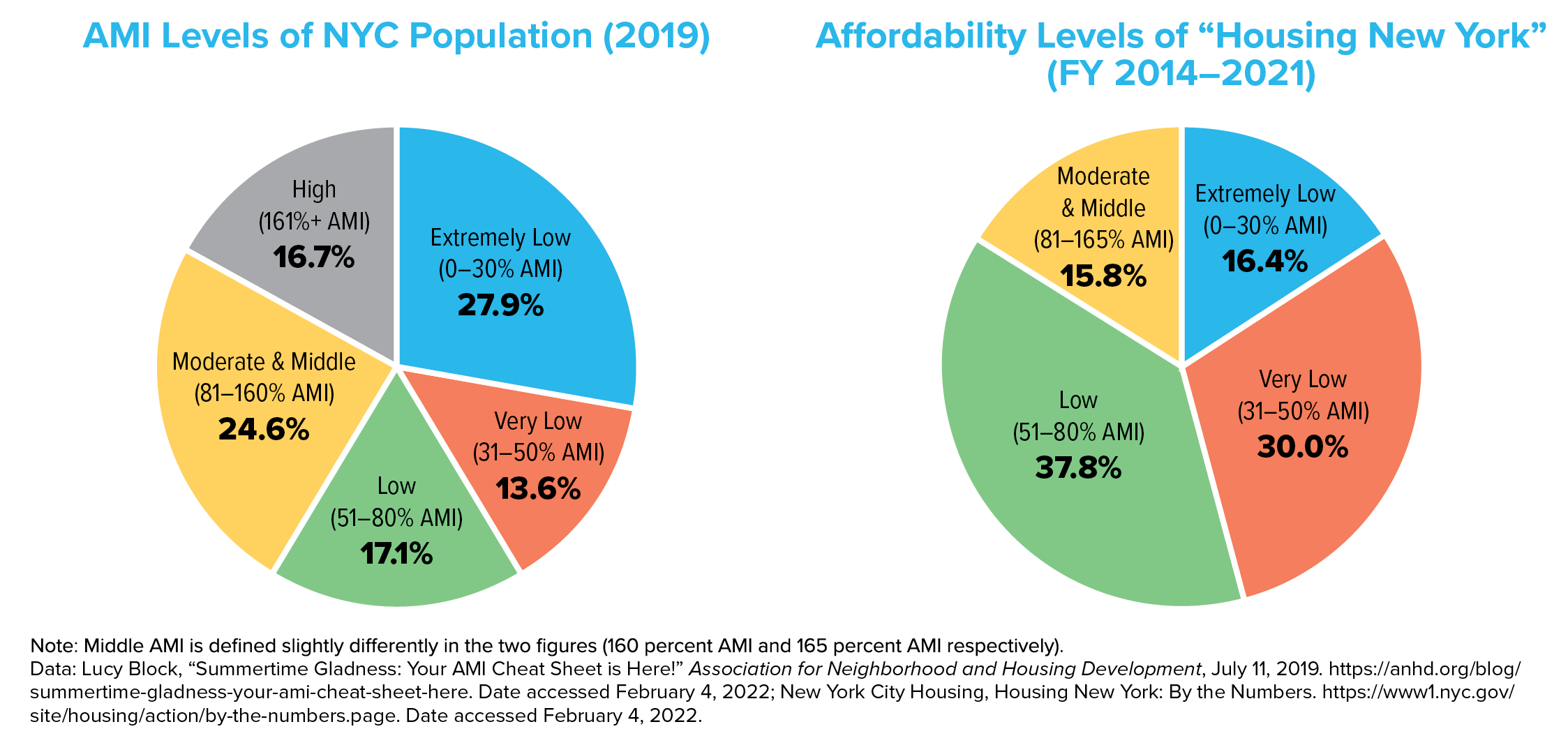 In the original Housing New York plan, the goal was to reserve 20 percent of affordable units for extremely low income and very low income renters,72 revised in Housing New York 2.0 to 25 percent of units.73 However, this still did not go far enough to meet the needs of New York’s most vulnerable households. A 2019 fact sheet from the Association for Neighborhood and Housing Development showed that two in every five New Yorkers (42 percent) were extremely low income or very low income,74 making less than 50 percent of AMI, which in 2021 was $53,700 for a family of three.75 That percentage – 42 percent – is likely to have increased due to the economic devastation of the COVID-19 pandemic. And families in shelter and exiting shelter typically earn far less than 50 percent of AMI. A report from the National Low Income Housing Coalition found that average annual income for a family after exiting shelter was $13,531,76 which in 2021 dollars was just over $15,000, or 14 percent of AMI. With this stark reality in mind, it is clear that Housing New York 2.0 did not go far enough to ensure affordable housing as a solution to homelessness.