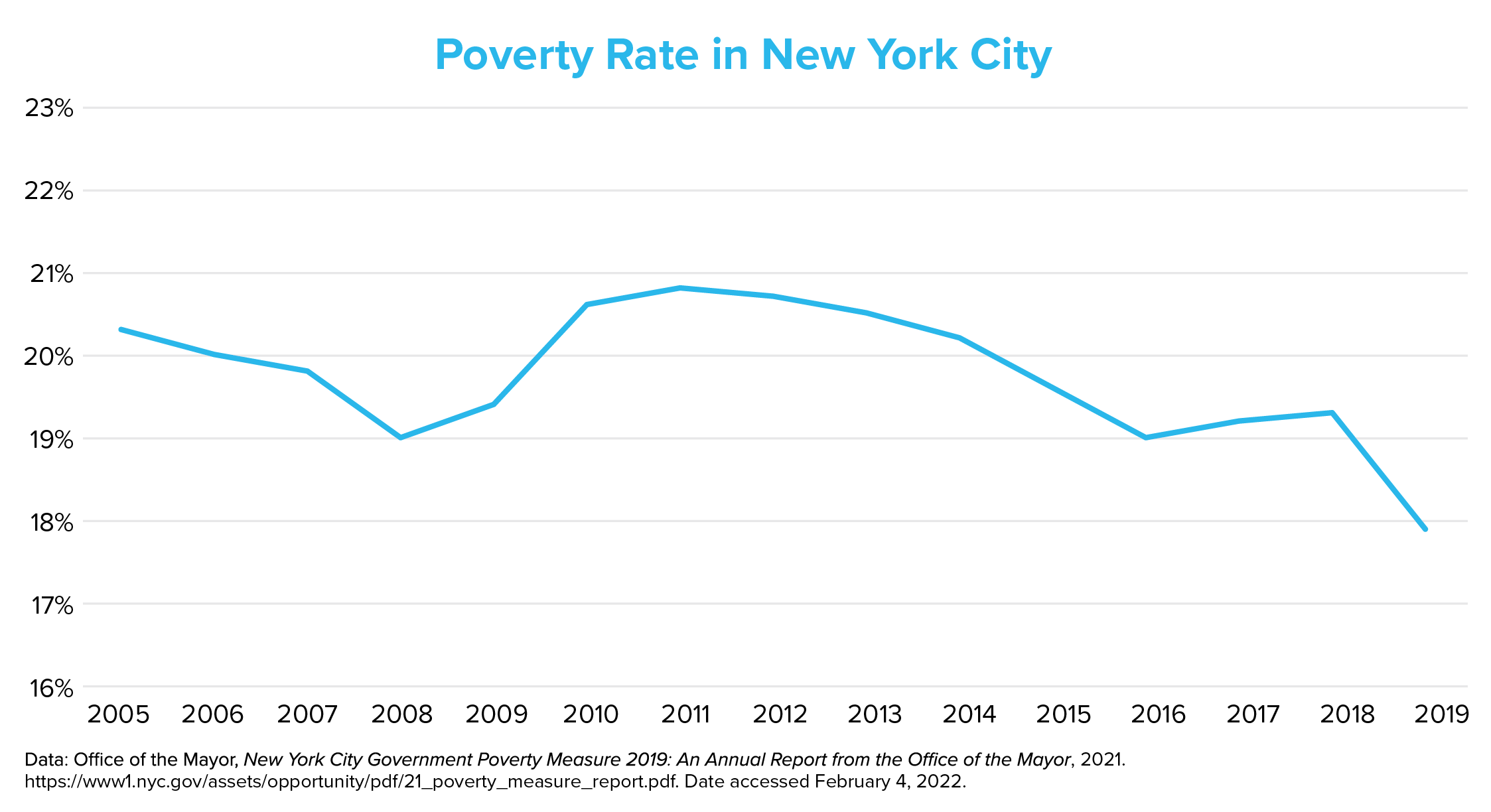 In a report the de Blasio administration published a month before he left office, he notes that by 2019, the wage share for the bottom 50 percent of earners rose by 15 percent while it fell for many workers in the top 20 percent of earners. Furthermore, New York City’s poverty rate decreased to approximately 13 percent, the lowest rate since 2005, when the City began tracking it.79 There are several key policies that may have contributed to these trends—and may continue to improve the lives of low-income and homeless New Yorkers in the years to come.