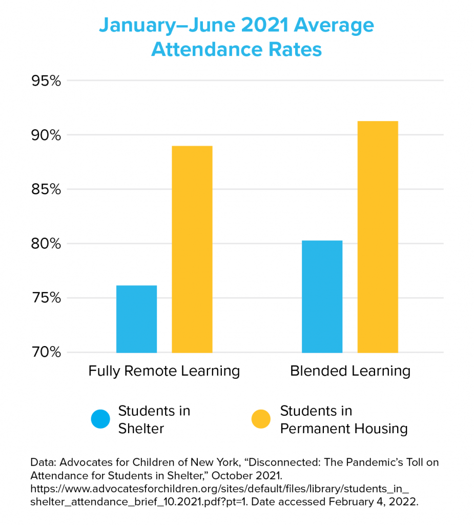 In the fall of 2020, the de Blasio administration and the DOE allowed students to come back to school remotely or through a blended model. School buildings were shut down in mid-November—less than two months after opening, however. Elementary schools reopened on December 7, 2020.92 District 75 special education schools for grades K–12 returned on December 10,93 but all other middle and high schoolers citywide were kept remote until February 25, 202194 and March 22, 2021,95 respectively. A policy brief by Advocates for Children of New York examined the impact of remote and blended learning on homeless students during the school year. Their analysis found that overall monthly attendance rates for students living in shelter were dramatically lower (10.6 to 14.1 percentage points) than those of students living in permanent housing.