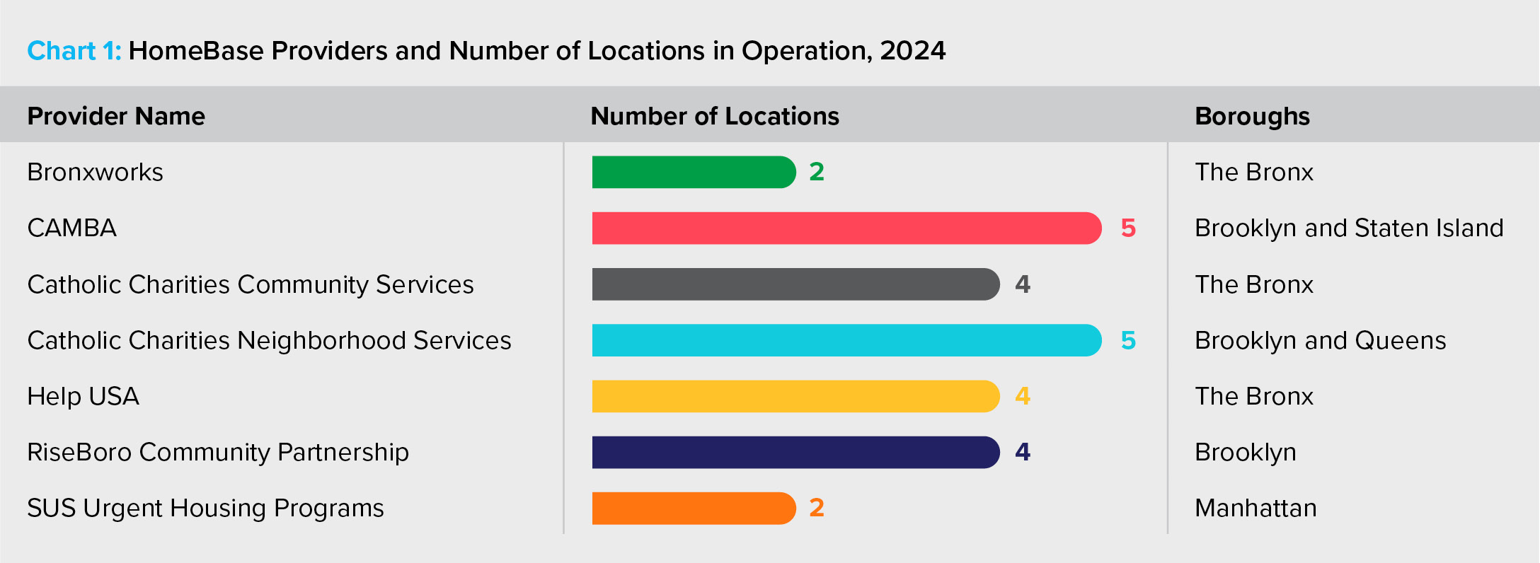 HomeBase providers – Nonprofit organizations that contract with New York City government agencies to deliver homelessness prevention services within their local communities.