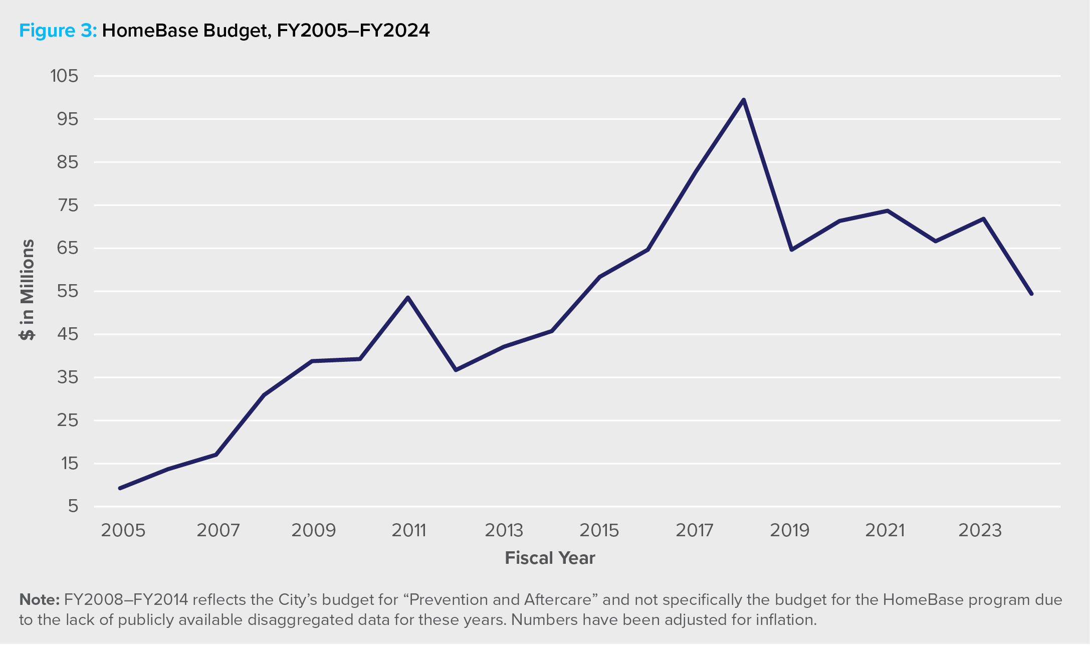 This report will examine the history of HomeBase, how it works to prevent homelessness, and its impact on families with children experiencing housing instability. The program is not inexpensive—the City has spent approximately $1 billion (adjusted for inflation) over its lifetime—but it’s a small percentage of the over $2 billion that has been budgeted for the Department of Homeless Services every year since FY2018, especially since prevention is a critical and necessary piece of how New York City can seek to reduce the shelter population.1 In the coming sections, we will look at what evaluations exist of HomeBase and where the gaps are in the public’s understanding of the program. By filling in these gaps, policymakers can start to design ways to strengthen our city’s safety net, preventing families from losing stable housing and entering the shelter system.