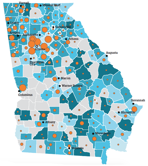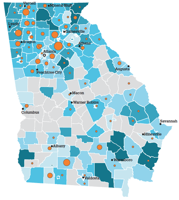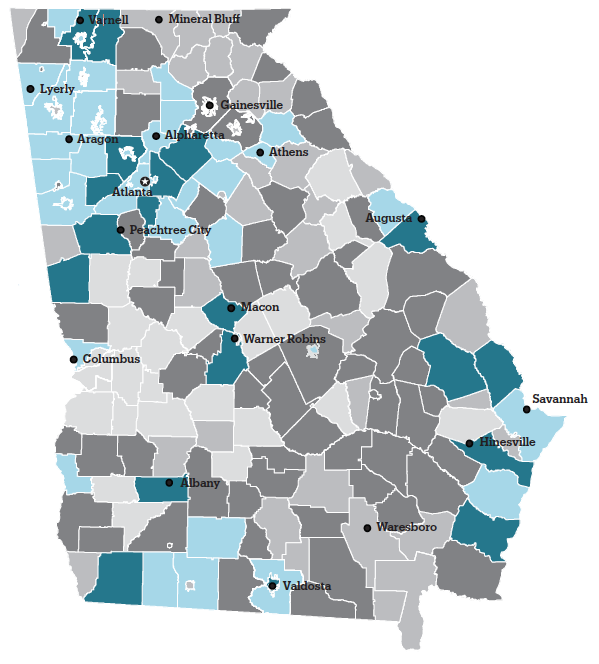 - Homelessness was disproportionately seen in Georgia’s small towns and rural areas. Despite enrolling only 32% of the total student population in the state, these districts accounted for 40% of all homeless students.