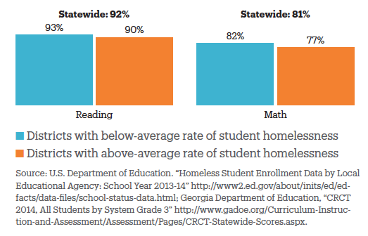 - The achievement gap between districts with high and low rates of homelessness was narrow. Third grade students in areas with above-average student homelessness passed their state assessments at rates only 3-5 percentage points lower than in districts with below-average rates of student homelessness.