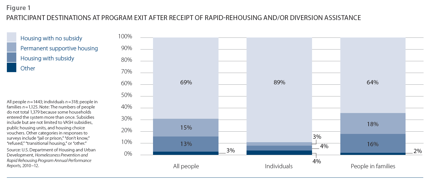 When differences between families and individuals were explored, a much higher percentage of families than singles were found to have exited to permanent supportive housing (18% vs. 3%) or exited the program with some other ongoing housing subsidy (16% vs. 4%). For the 34% of families who exited into either permanent supportive housing (18%) or housing with subsidies (16%), assistance was used primarily to tide over households in shelter or other temporary housing who were awaiting placement into long-term programs such as supportive housing, public housing units, or housing choice vouchers. The remaining two-thirds of families exited to permanent housing without further rental assistance. In addition, almost nine out of ten single adults (89%) who participated in the program exited without further subsidies.