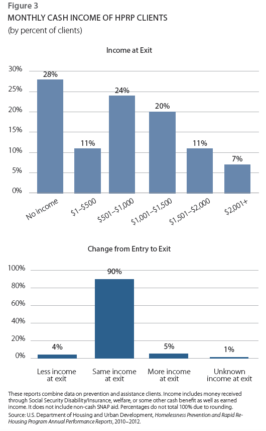 The vital importance of using household income to target services and resources is apparent when data show that 90% of all households had no change in income between entering and exiting the program (see Figure 3). Because OSH chose to target rapid-rehousing assistance only to those with sufficient income at entry, strong housing outcomes were still achieved even after assistance ended, despite income’s remaining fairly constant. The more than one in four adults who had no income at all at the end of the program likely represent households in need of more intensive service interventions or awaiting placement into permanent subsidy programs. The fact that this group made up a quarter of the population served points to the need for a multifaceted and targeted approach that includes temporary service-rich housing options, permanent housing subsidies, and rental assistance.