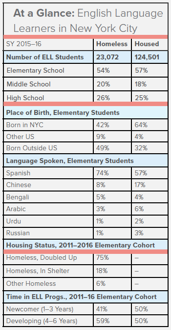 • The needs of more than 23,000 homeless ELL students must be included in this planning as the New York City DOE is in the midst of broad ELL reforms. These reforms are calling for universal bilingual services for all ELL students and allocating $40 million towards additional resources in SY 2016–17.