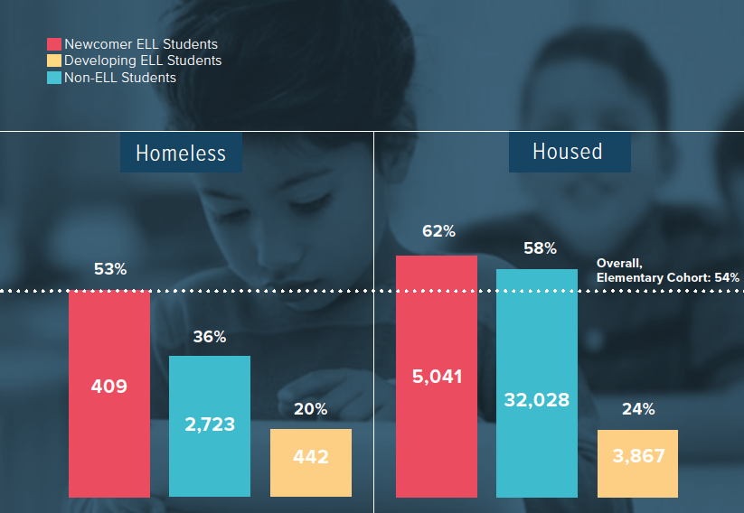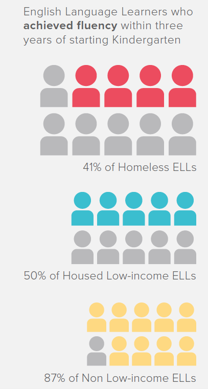 ELLs experiencing homelessness take longer to learn English than their housed peers, on average. In the 2011–2016 elementary cohort, 41% of homeless ELL students reached fluency in English within three years, compared to 50% of low-income housed students and 87% of non-low-income housed students.