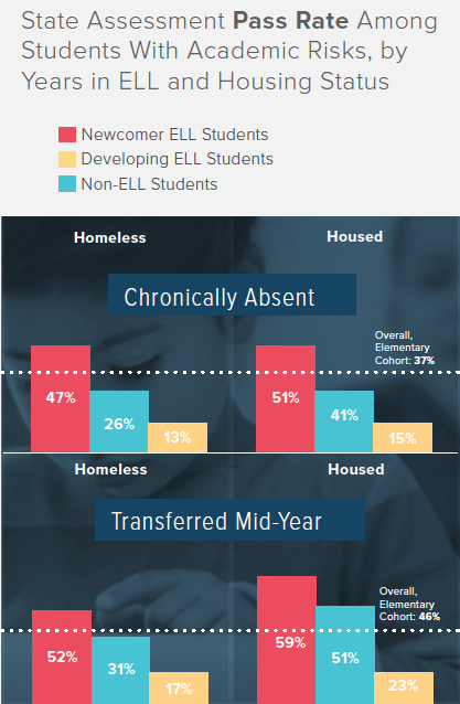 Homeless students are more likely than their housed peers to be chronically absent and to transfer schools mid-year. This heightened classroom instability can often mean that homeless students fall behind academically. However, homeless newcomer ELL students excel academically even when they are chronically absent or change classrooms.