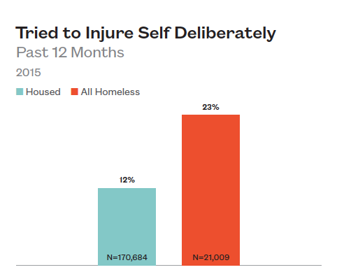 Nearly a quarter of homeless high school students deliberately hurt themselves, two times more than housed students (23% to 12%).