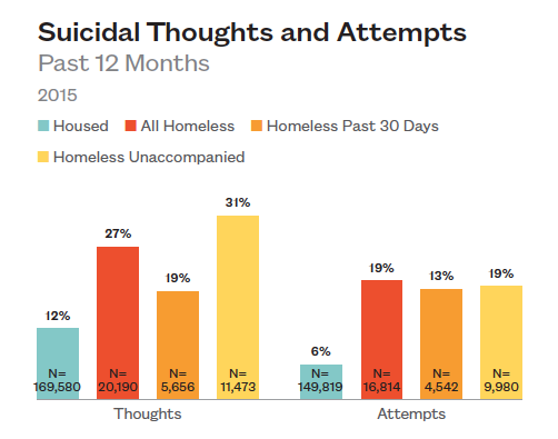 Not only do homeless high school students consider suicide more often than their housed peers, but they are also more than three times more likely to have attempted suicide in the last year (19% to 6%).