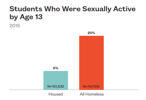 Homeless teens become sexually active at a much younger age than their housed peers—20% start having sex before they turn 13. This is over three times the rate of housed teens (6%).