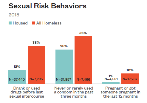 Homeless high school students are at a much greater risk of pregnancy than their housed peers. In the past 12 months, about one in ten homeless students got pregnant or got someone pregnant, compared to only one in 100 housed students (10% to 1%).