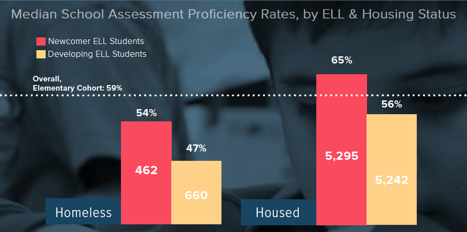 - Homeless ELL students who speak Chinese, Bengali, Urdu, or other languages attended schools with higher proficiency rates (72%) than Spanish-speaking homeless ELLs (52%).