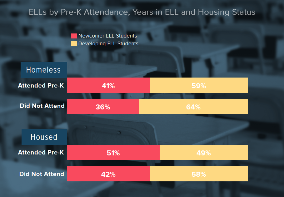 Given the additional support needs of homeless ELLs and their higher likelihood of chronic absenteeism and mid-year school transfers, reaching homeless families for services earlier is better. Homeless ELLs who attended pre-K were more likely to learn English within three years, regardless of language spoken: more than 40% were newcomer ELLs compared to 36% of homeless ELLs who did not attend pre-K.