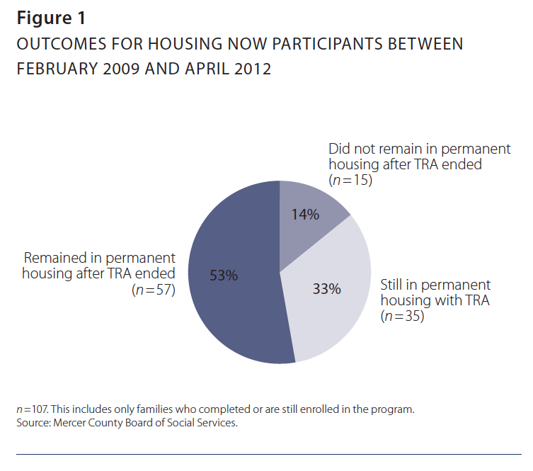 With a February 2009 award, Mercer County became one of 23 communities chosen by the U.S. Department of Housing and Urban Development to participate in the Federal Rapid Re-housing Demonstration for Families. In tandem with state money and dispensation to use Temporary Rental Assistance (TRA) grants usually reserved for families transitioning from Temporary Assistance for Needy Families (TANF) cash assistance, the Mercer County Board of Social Services (MCBOSS) implemented Housing Now, the rapid-rehousing program for homeless families in the area. The county later introduced an expanded and modified version of Housing Now, called the Family Housing Initiative (FHI). Both programs provide a maximum of 18 months of fully paid rent to already homeless families (extensions are made in certain circumstances), and county case managers make efforts to transition families from receipt of aid before they reach the maximum assistance level. The hope is that once a family is established in a residence with prevention aid or TRA, they will remain housed after cash assistance ends.3 Though initially implemented as separate pilots, Housing Now and FHI now operate using the same guidelines, with case management provided by MCBOSS and a local nonprofit organization.4