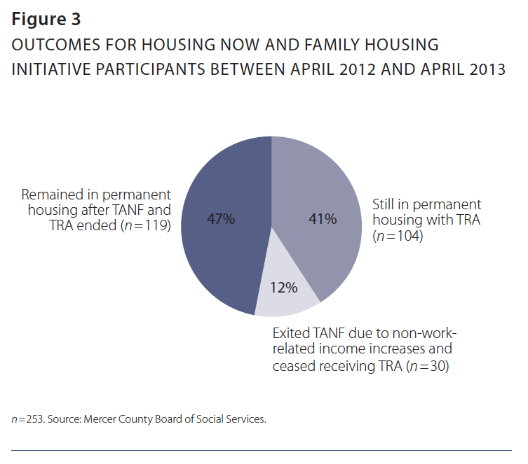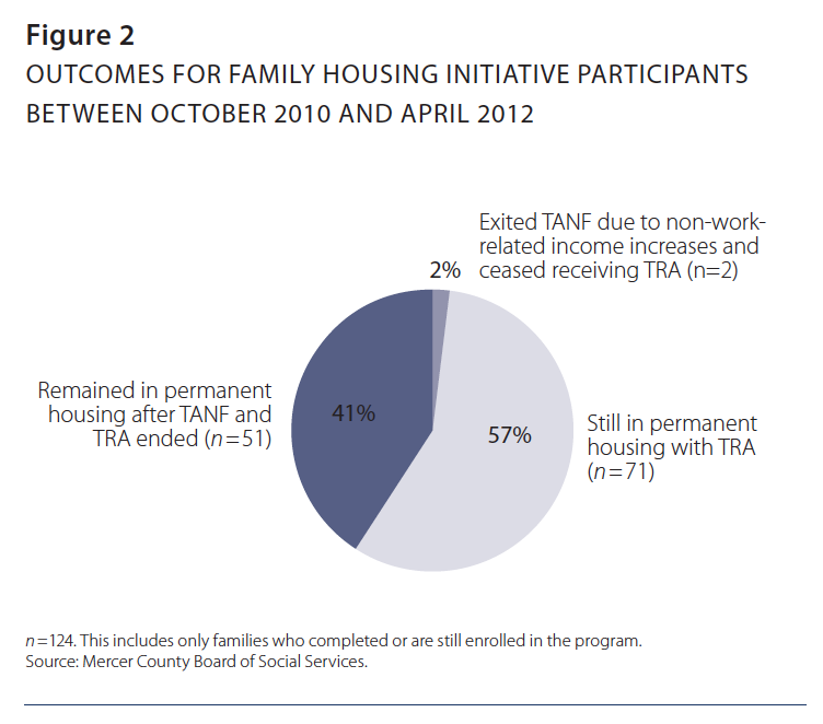 In October 2010 Mercer County implemented the Family Housing Initiative (FHI). Between its inception and April 2012, the program served at least 124 families.16 Of these, 51 exited both the FHI program and TANF due to employment and no longer received assistance. In May 2012, 71 families were still receiving TRA and using case-management services. A small handful left TANF due to increases in income outside employment (see Figure 2). Mercer County now has access to Homeless Management