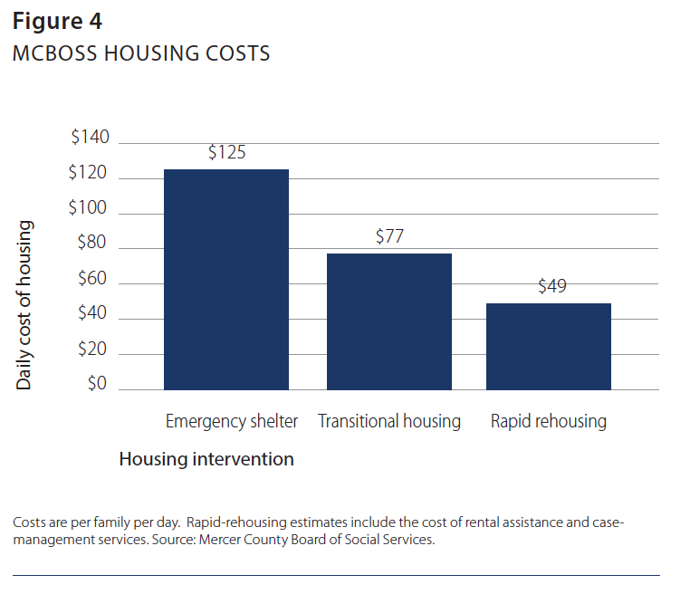 In February 2013 the U.S. Department of Health and Human Services reported that the Mercer County families involved in the FHI program had an average monthly income of $835, compared with $558 for the families exiting the county’s transitional housing.18 With the reported daily cost of rapid rehousing at $49.35 (the combined cost of TRA and case management) per family, for every day that a family is in county-subsidized permanent housing as opposed to transitional housing, MCBOSS saves between $28 and $76 (see Figure 4).19