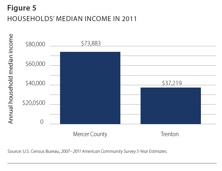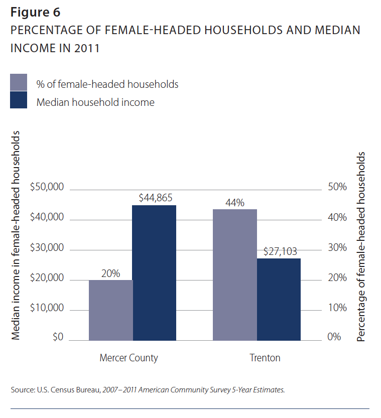 Yet the city of Trenton is an island of poverty in an otherwise wealthy county. The median household income for the city in 2011 was only $37,219, just over half of the figure for the county, which was $73,883 (see Figure 5).22 Further, Trenton is home to far more female-headed households (44%), whose median annual income was $27,103 in 2011. This is in contrast to the rest of Mercer County, in which female-headed households (20%) had a median annual income of $44,865 (see Figure 6).23 While only 3% of the county’s population received public assistance, the figure for Trenton was 9%, and the average income of the city’s residents who received public assistance was 25% less than that for cash-assistance recipients outside Trenton.24 Clearly, the county’s poor are not evenly spread across towns but, rather, are concentrated in Trenton.