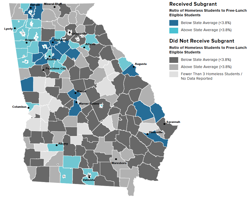 - In Georgia, 44% of school districts had a ratio of homeless students to free-lunch eligible students smaller than the statewide average (3.8%), including 15 that received subgrants.