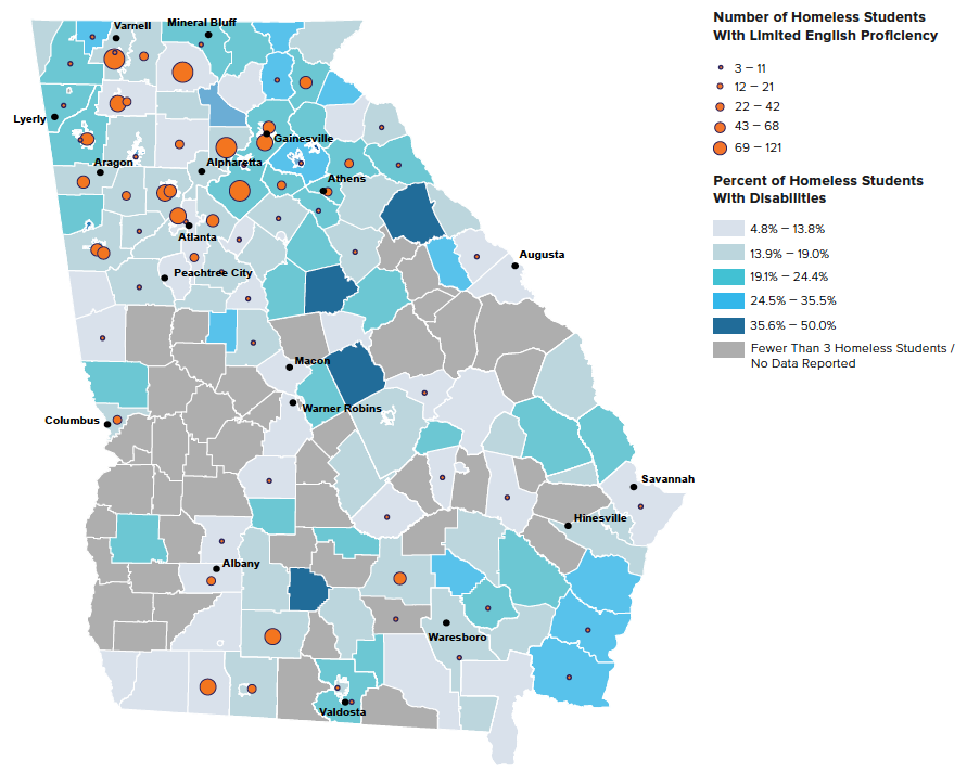 - In three school districts, over 30% of homeless students had limited English proficiency, over seven times the statewide rate for homeless students (Buford City, Gilmer County, and Atkinson County).