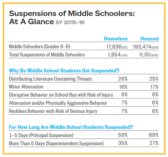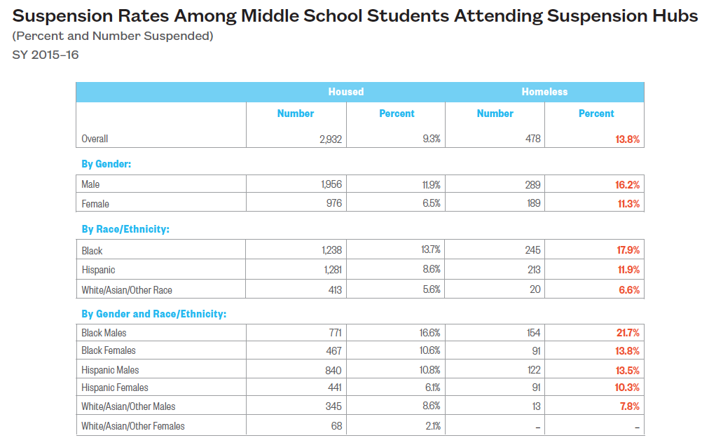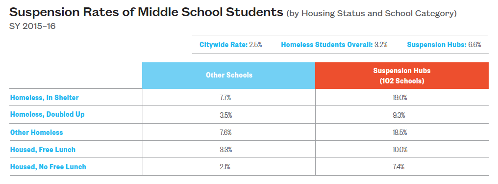 - Homeless middle school students in suspension hubs who lived in shelters (19.0%) and other temporary housing (18.5%) were more than seven times as likely to be suspended as the citywide rate (2.5%).