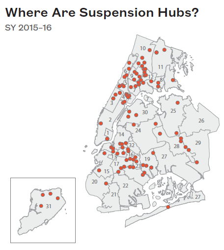 - Students who go to school in the south and west Bronx, upper Manhattan, and central Brooklyn are the most at risk of attending suspension hubs. Districts 8, 10, and 12 in the Bronx each had six suspension hubs serving middle school students.