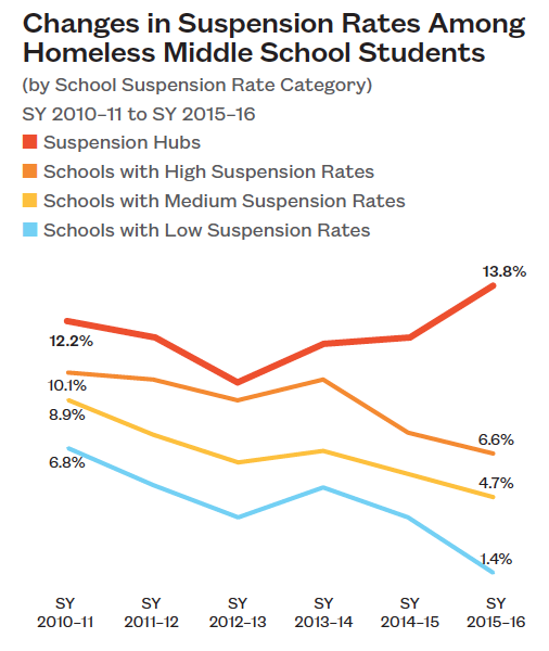 - Homeless middle school students in suspension hubs were three times more likely to be suspended than homeless students overall (13.8% to 4.2%).