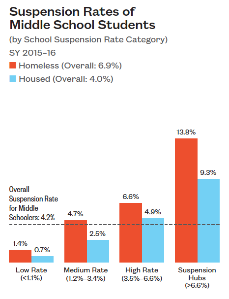 - Homeless middle school students not only face higher risks of attending a suspension hub, where rates exceed 6.6%, but are more likely to be suspended in these schools (13.8%).