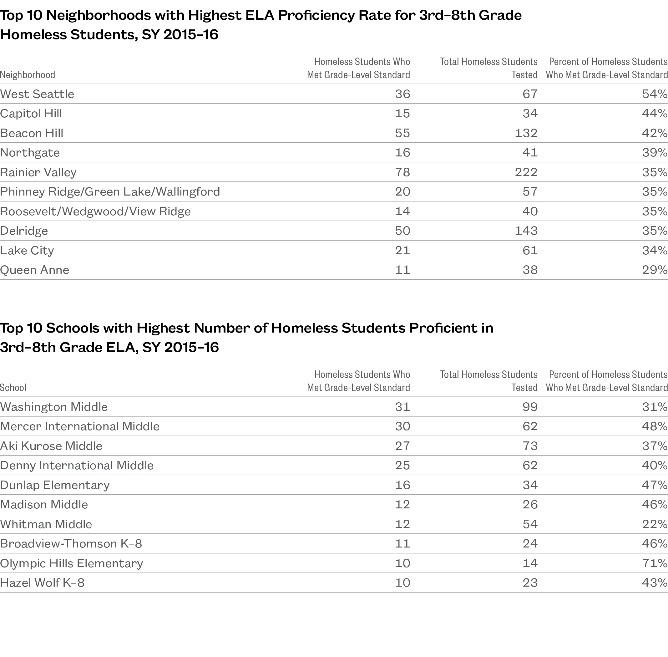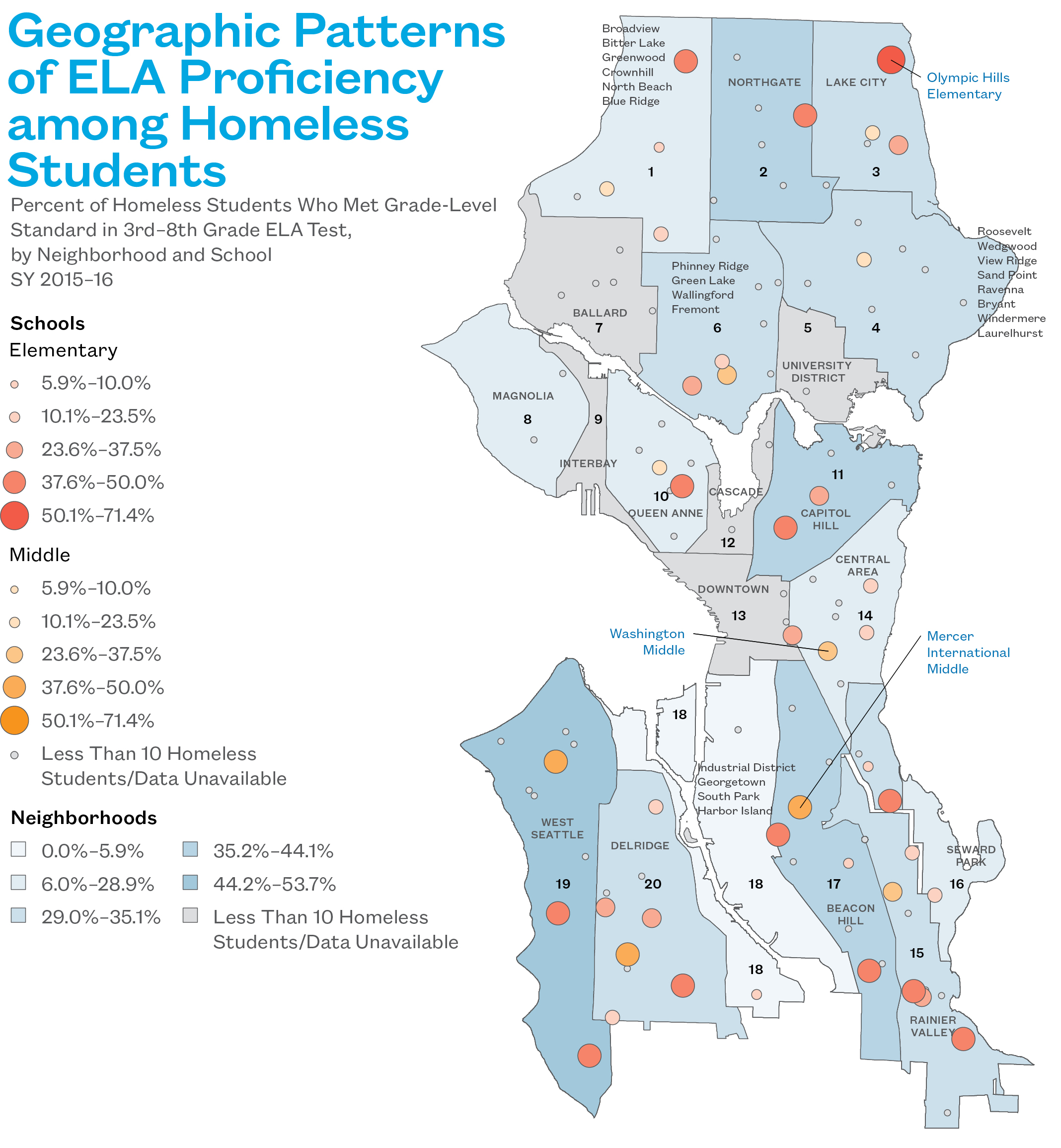 - In schools with at least 10 homeless students tested, Olympic Hills Elementary and Mercer International Middle had the highest ELA proficiency rates for their grade levels.