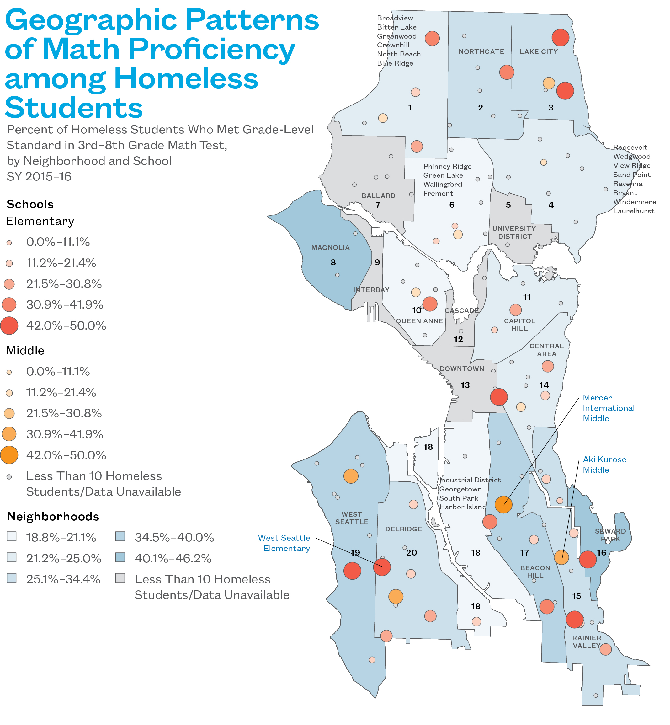 - In schools with at least 10 homeless students tested, West Seattle Elementary and Mercer International Middle had the highest math proficiency rates for their grade levels.