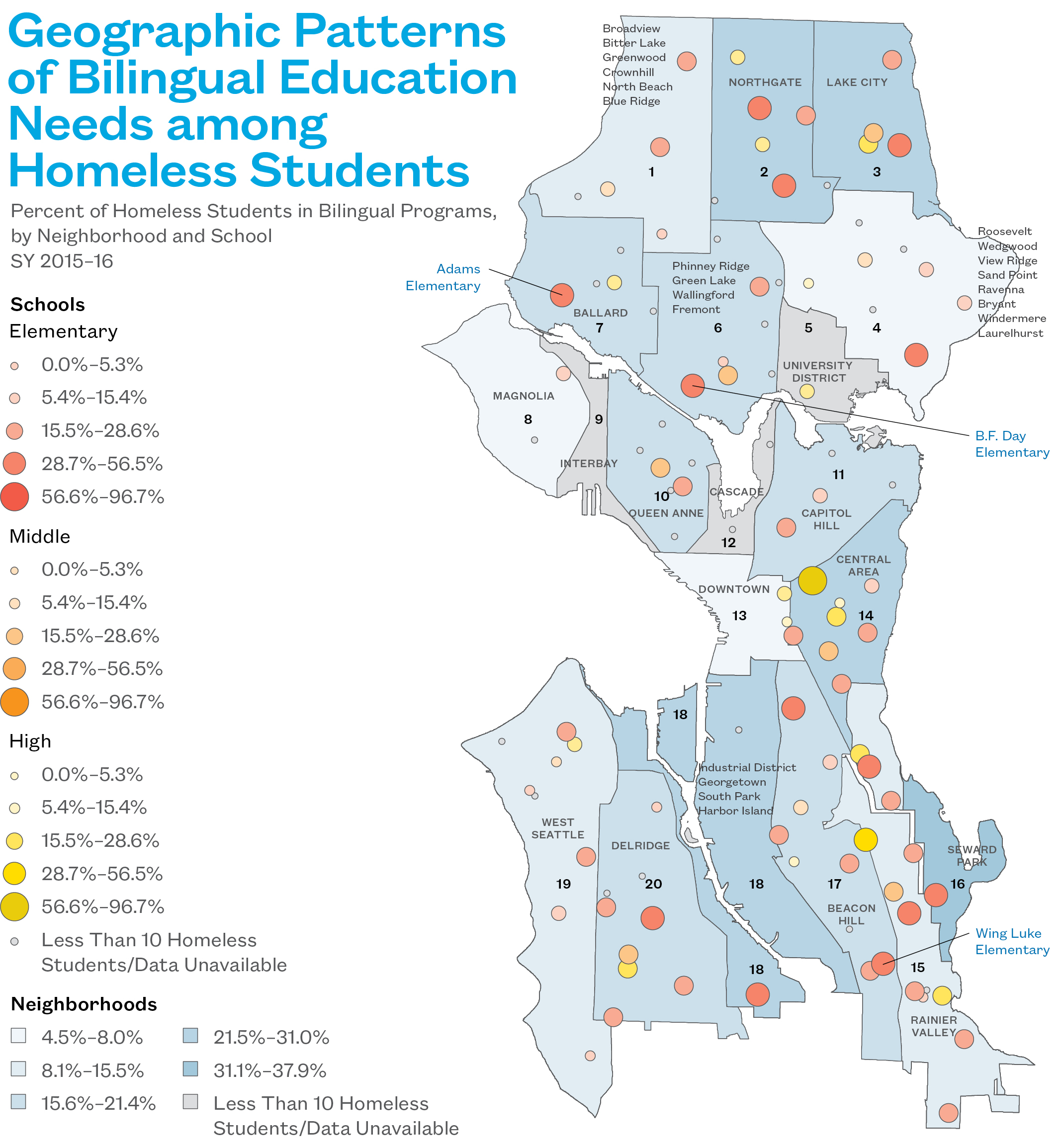 - Among mainstream schools, Adams Elementary, B.F. Day Elementary, and Wing Luke Elementary had the highest rates of bilingual needs among homeless students.