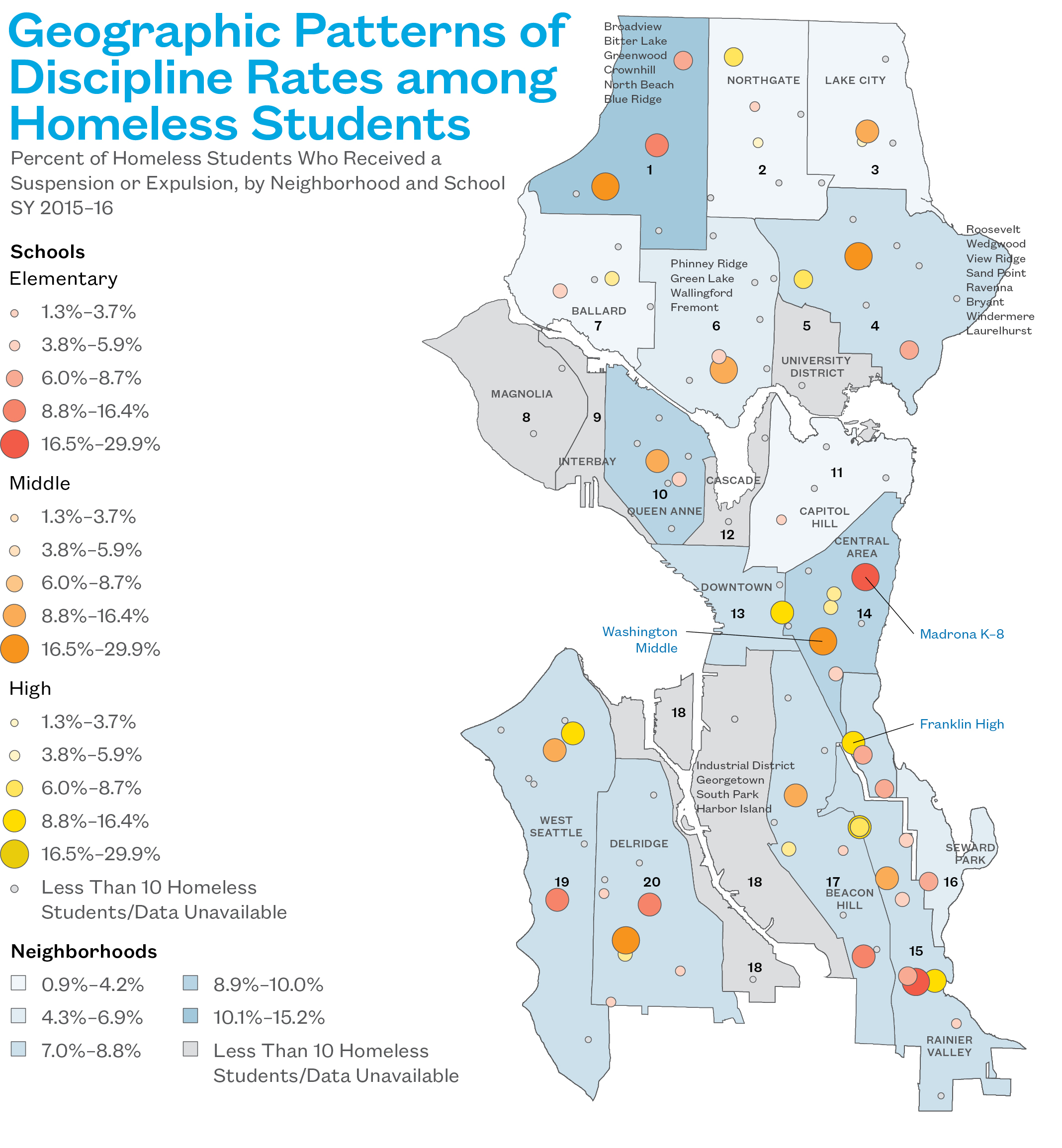 - Fifteen percent of homeless students in the Broadview/Bitter Lake neighborhood were given suspensions or expelled during SY 2015–16.