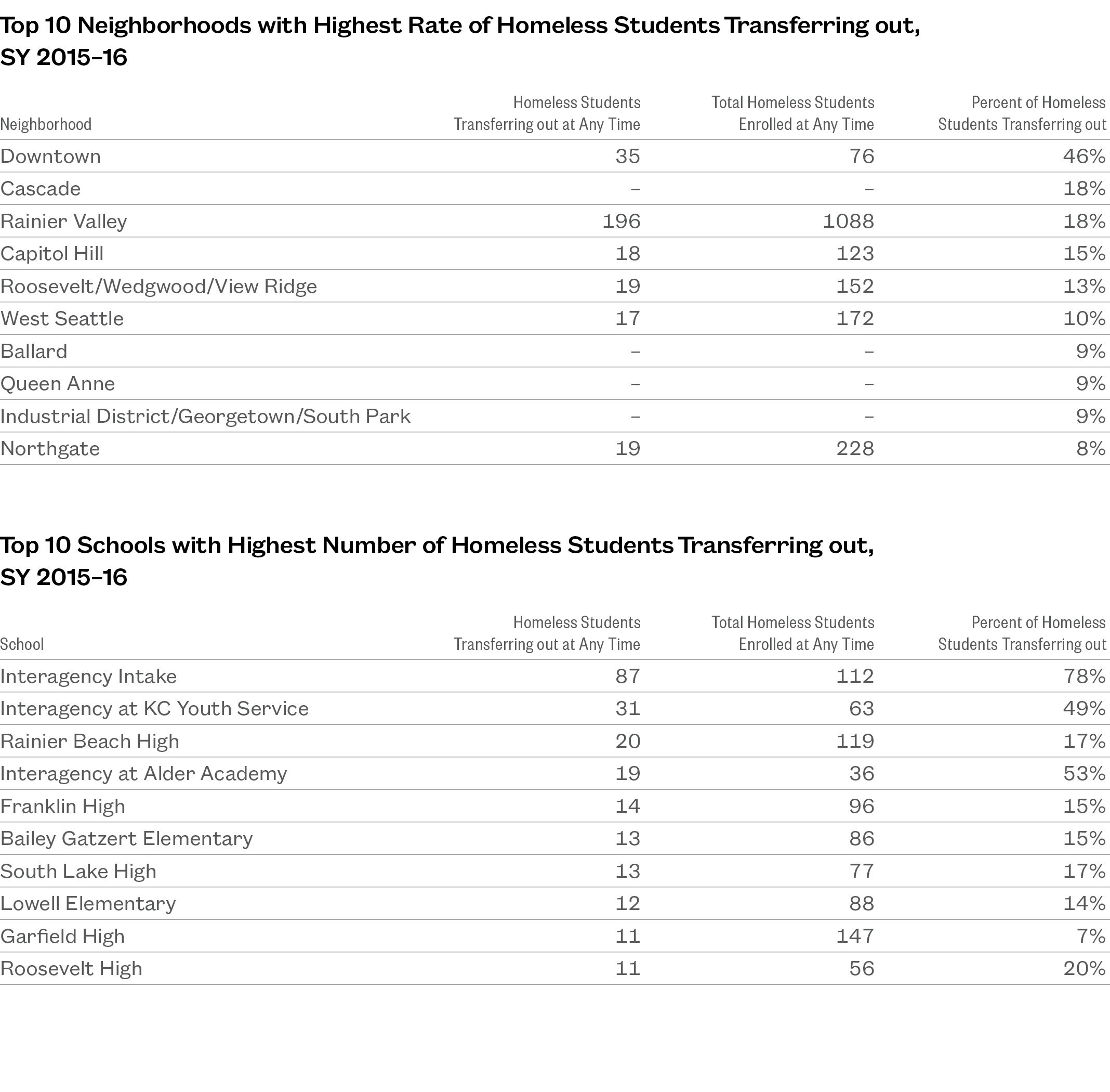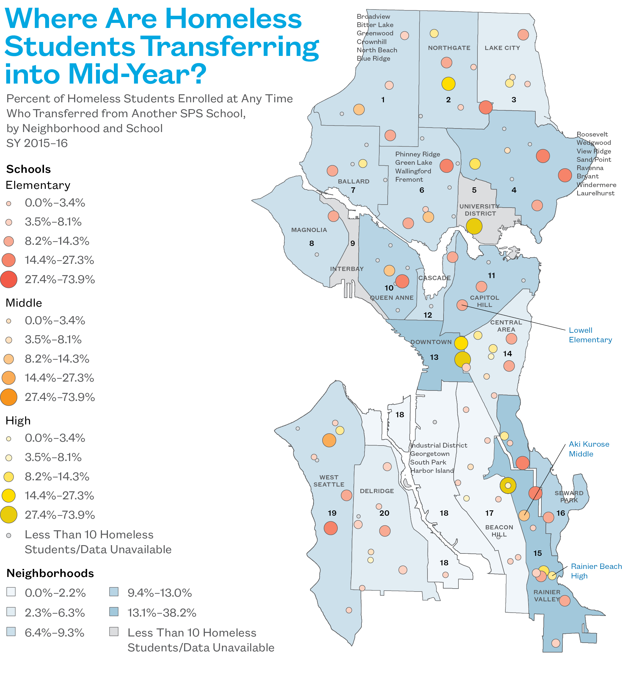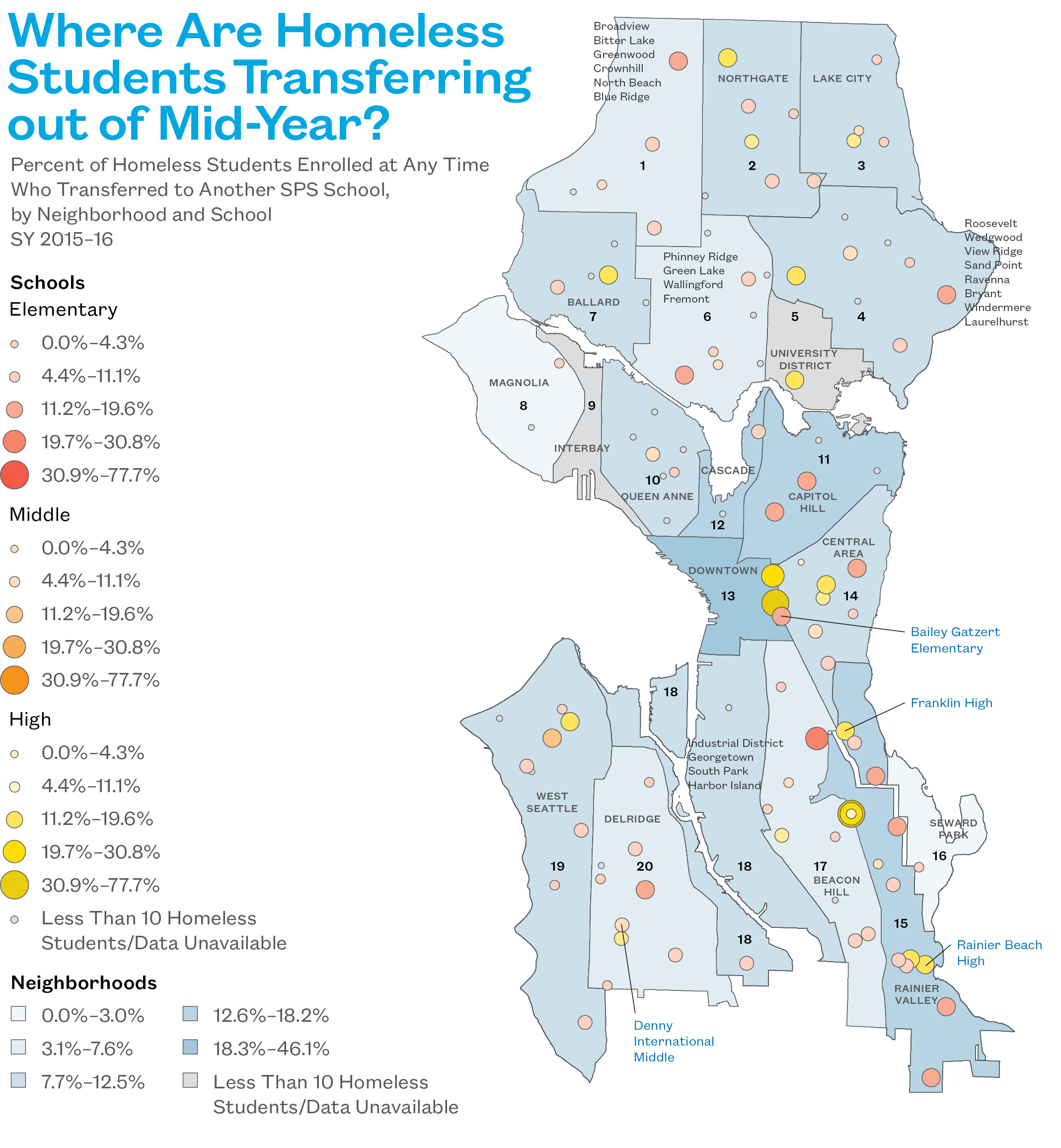 - Downtown and Rainier Valley had high rates of homeless students transferring both in and out of the neighborhood.