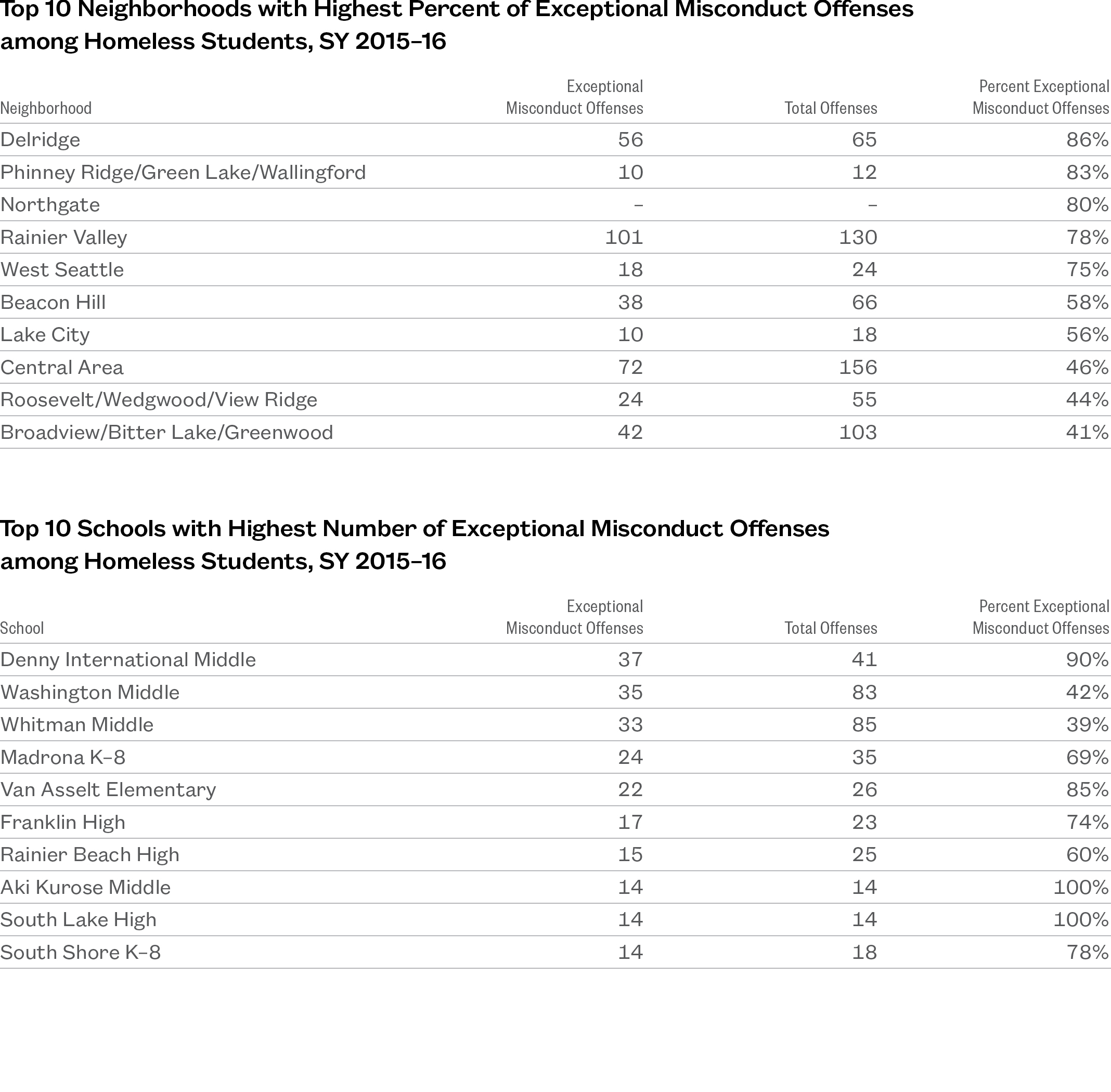 - Over 80% of the disciplinary incidents involving homeless students in Delridge, Phinney Ridge/Green Lake, and Northgate were categorized as “Exceptional Misconduct.”