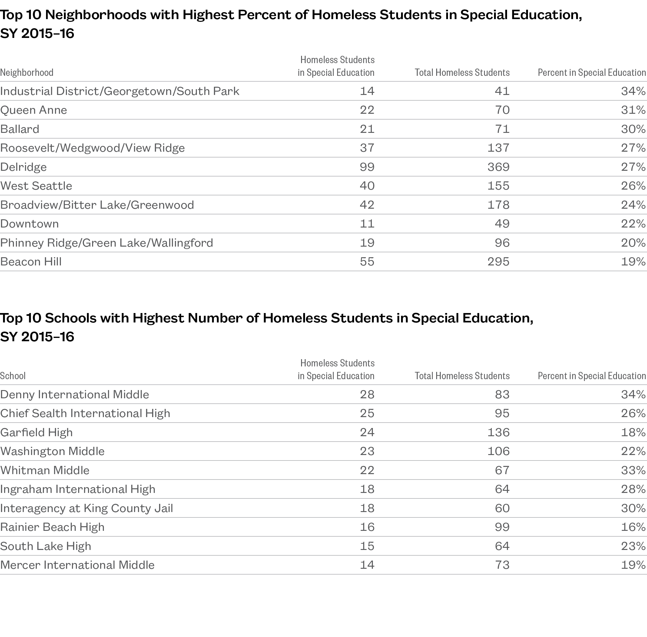 - Denny International Middle, Chief Sealth International High, and Garfield High had the highest number of homeless students in special education.