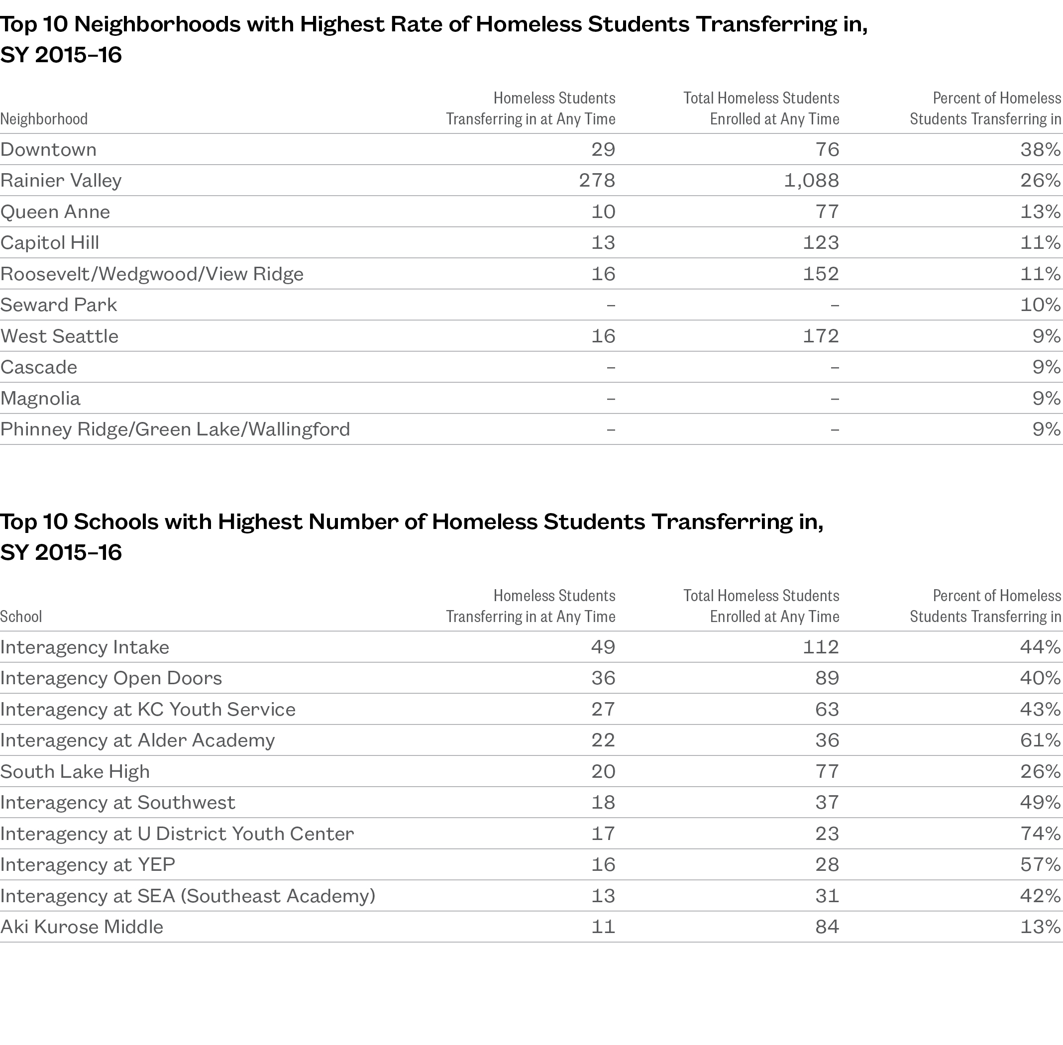 Rainier Valley, Capitol Hill, Lake City, and Seward Park. - Interagency Academy, a network of alternative high schools, enrolls many of the city’s homeless students. Thirteen percent of homeless students were in Interagency Academy during SY 2015–16, and 36% of all students within the network were identified as homeless that year. Interagency Academy locations were also consistently among the schools with the highest transfer rates for homeless students.