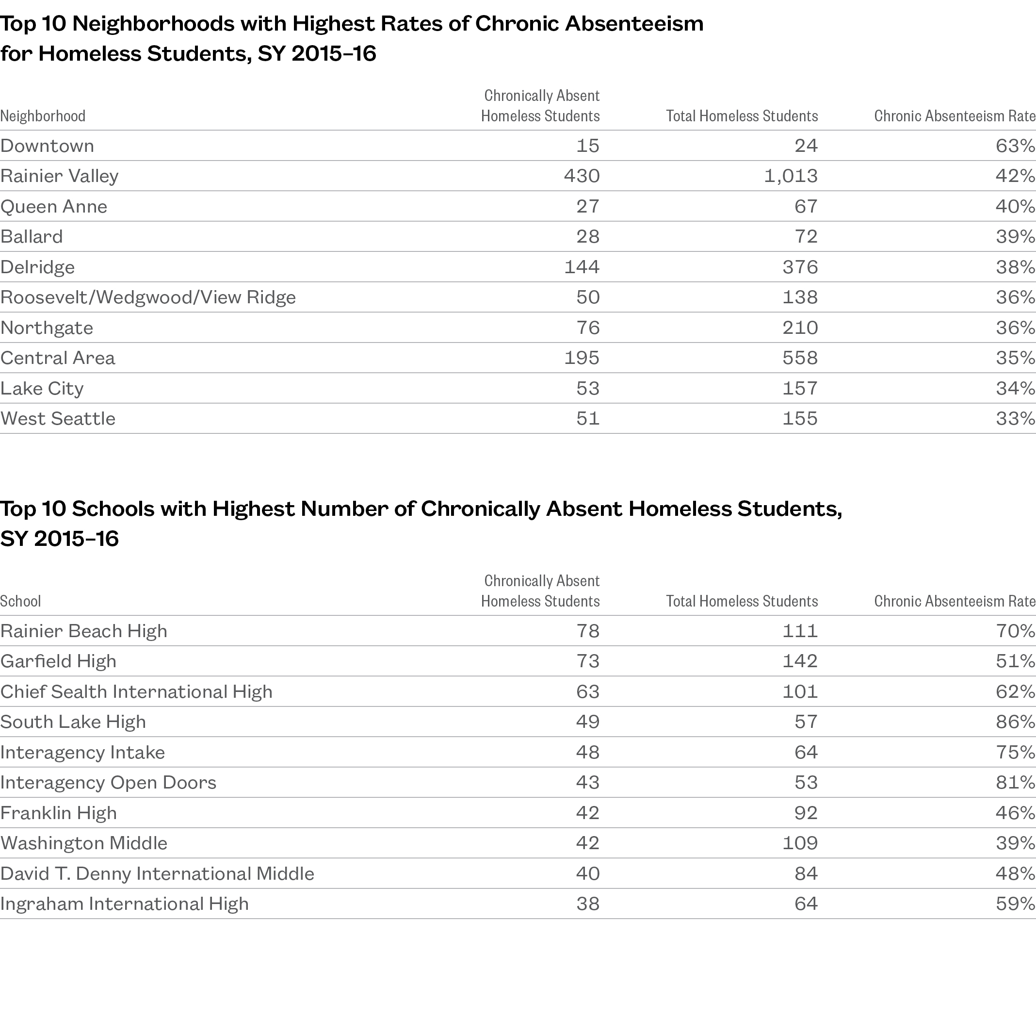 - Downtown, Rainier Valley, and Queen Anne had the highest rates of chronic absenteeism among homeless students. Phinney Ridge/Green Lake and Capitol Hill had the lowest.
