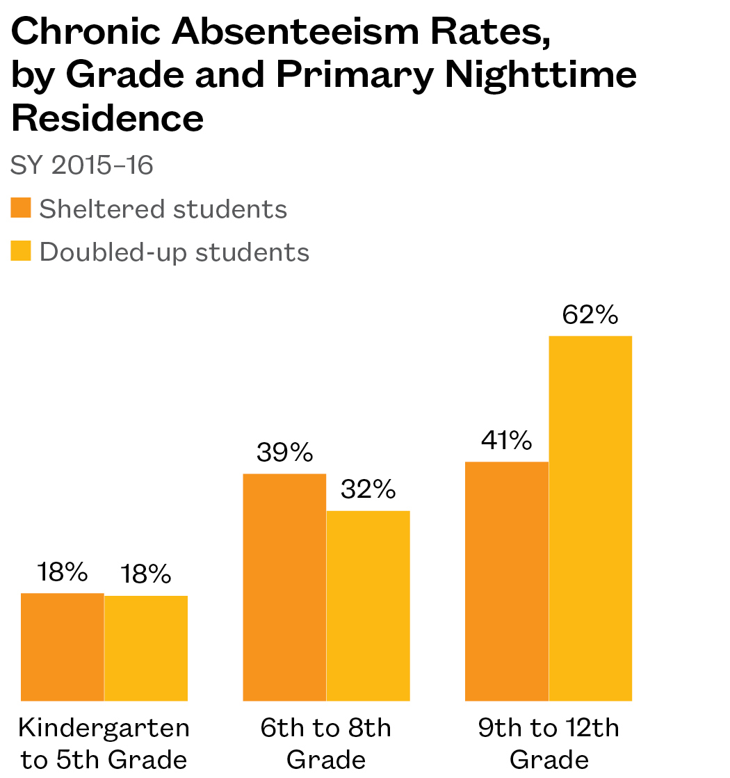 - In high school, nearly two-thirds of doubled-up students missed 18 days or more of school. Forty-one percent of high school students in shelter were also chronically absent.